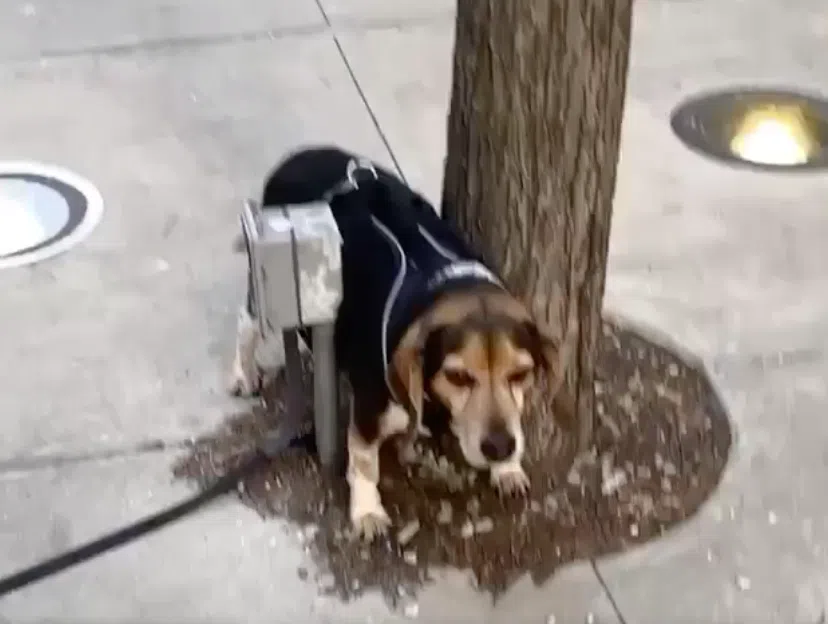 Detlef the dog somehow got himself stuck in between a tree and one of those outdoor outlet things all around downtown.
