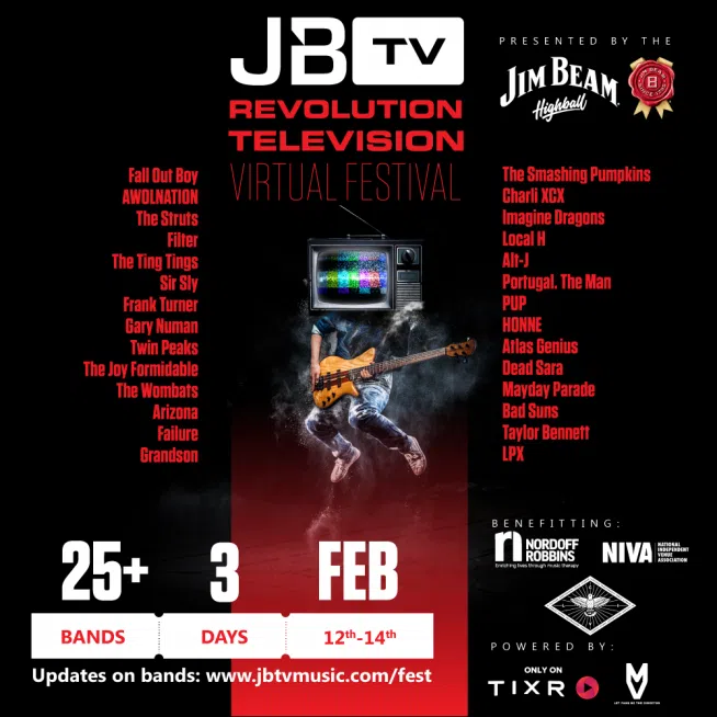 #JBTVFest is here! Your favorite bands in your living room. @falloutboy, @SmashingPumpkin, @charli_xcx, and more! All for a great cause to save our stages. Get your tickets today! https://t.co/5FkdTYRDy9 pic.twitter.com/MybNeSmXGa