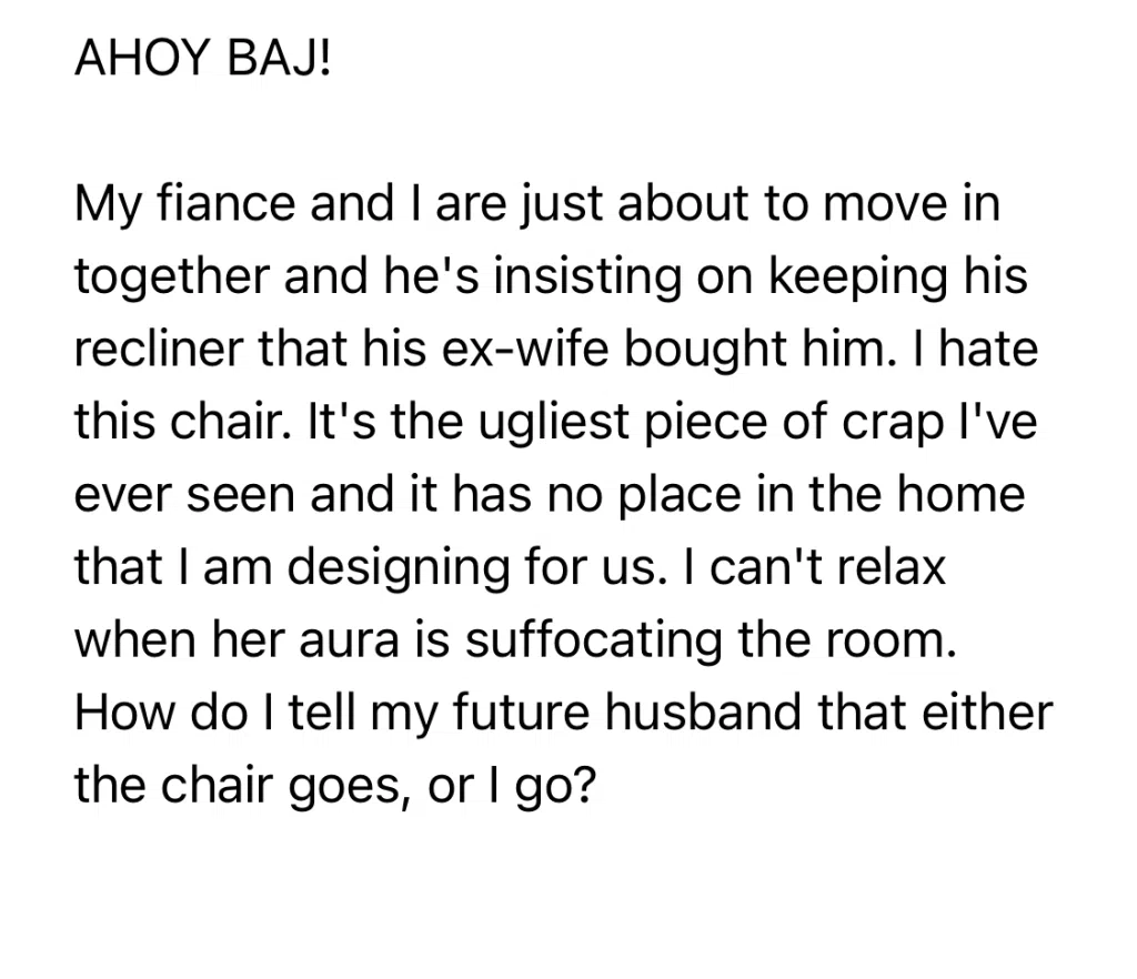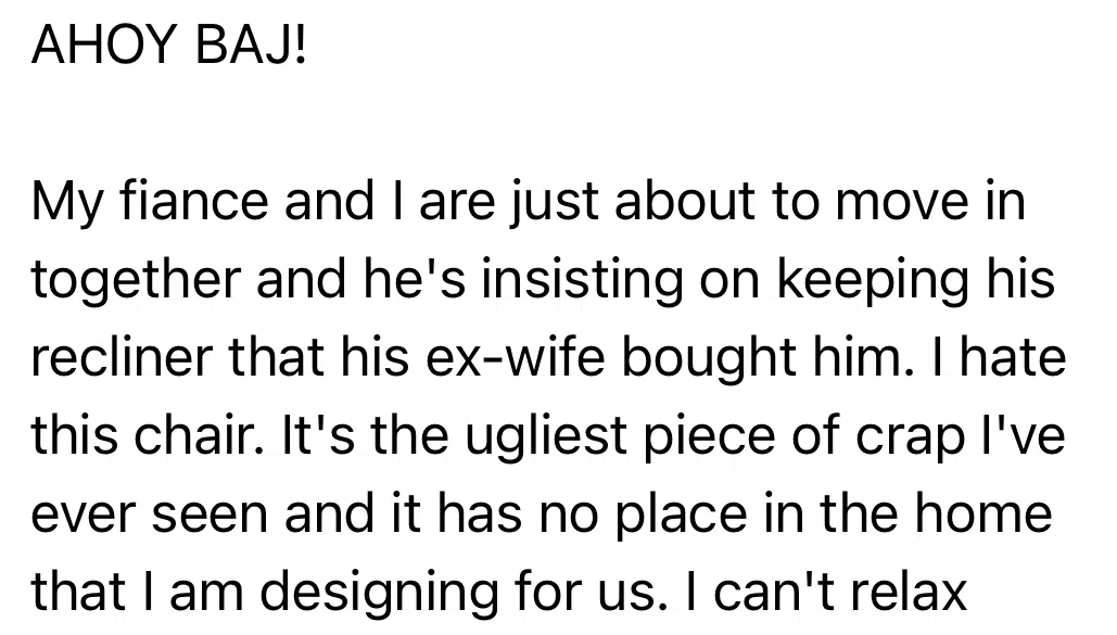 Relationship Court: She hates his chair from a previous relationship. They’re moving in together- does he have to have this eyesore of a recliner in the room?!
